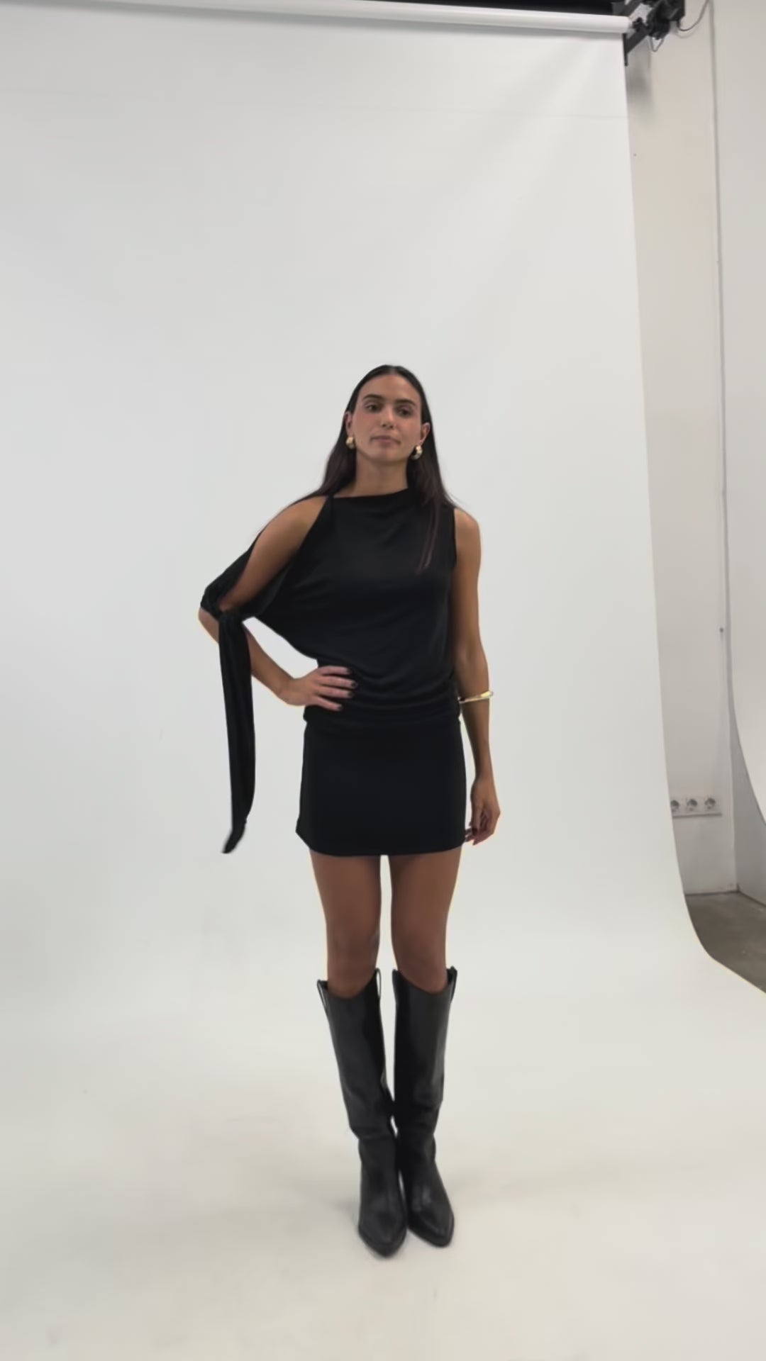 Vestido negro corto con fruncidos, diseño de hombro descubierto y detalle elegante de botón.
