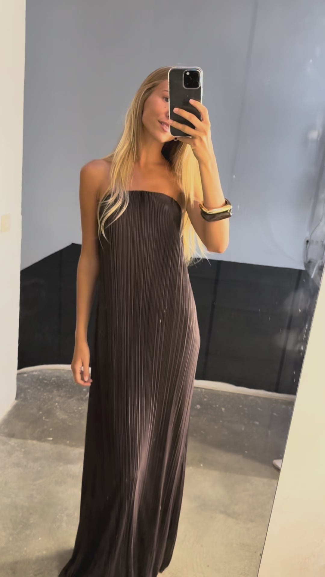 Vestido largo de palabra de honor en color marrón chocolate con busto elástico para un ajuste perfecto.