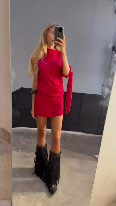 Vestido rojo corto con fruncidos, diseño de hombro descubierto y detalle elegante de botón.