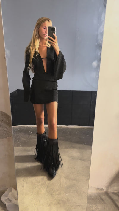 Vestido corto en negro brillante con mangas acampanadas. Escote fijo con cierre central y forro interior.